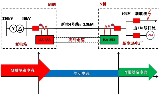 2007年8月5日某220kV變電站10kV重生4號線光纖分相電流差動保護動作,開關跳閘,經巡線人員檢查、毛病點在新聯線出口0號杆處保護人員檢查兩邊保護裝置,仿照區內外毛病保護均反應正確,如下圖所示,試剖析跳閘緣由。