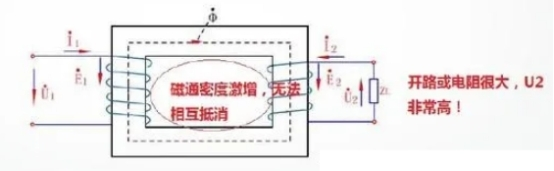 電dian流liu互hu感gan器qi在zai正zheng常chang作zuo業ye時shi,它ta的de一yi次ci磁ci勢shi與yu二er次ci磁ci勢shi是shi彼bi此ci均jun衡heng的de。一yi旦dan二er次ci側ce開kai路lu,二er次ci電dian流liu等deng於yu零ling,一yi次ci線xian圈quan的de電dian動dong勢shi堅jian持chi不bu變bian,一yi次ci電dian流liu悉xi數shu成cheng為wei勵li磁ci電dian流liu,這zhe將jiang引yin起qi鐵tie芯xin中zhong磁ci通tong量liangΦ急劇上升,這個急劇上升磁通量或許引起鐵芯磁飽或許或許在二次側感應出較高的電壓。