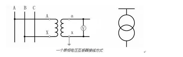 一個單相電壓互感器的接線,用於對稱的三相電路,二次側可接外表和繼電器。