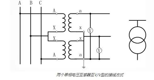兩個單相電壓互感器的V/V形接線,可測量線電壓,但不能測相電壓,它遍及應用在20kV以下中性點不接地或經消弧線圖接地的電網中。
